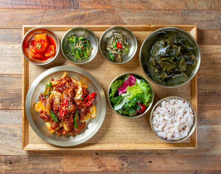 건강하고 맛있게 매콤한 집밥 같은 제육볶음 밥상입니다.