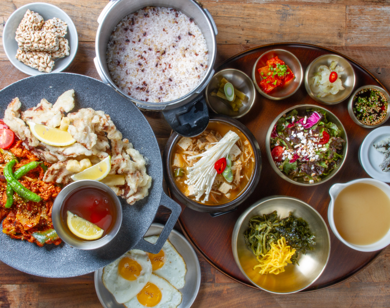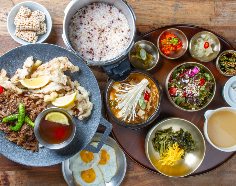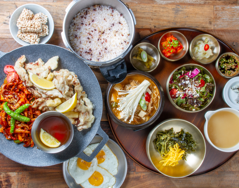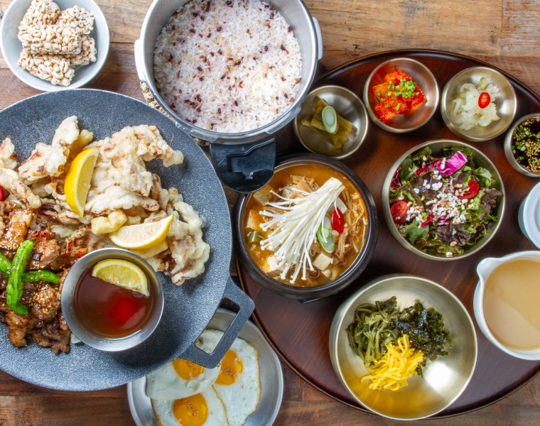 메인요리 + 된장찌개 + 반찬3개 + 샐러드 + 김포금쌀단호박식혜