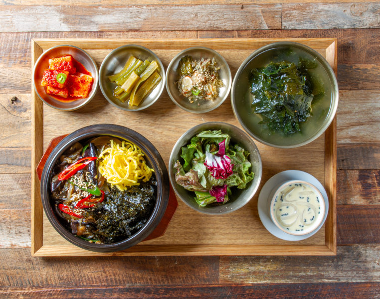 가지볶음비빔밥 + 기장들깨미역국 + 우도우뭇콩국