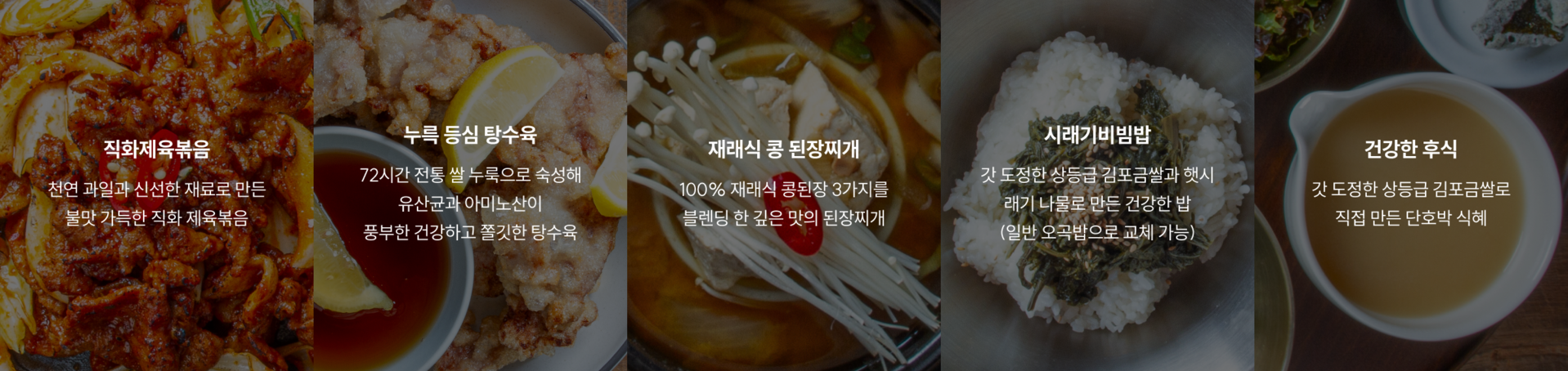 메인요리 + 된장찌개 + 반찬3개 + 샐러드 + 김포금쌀 단호박식혜